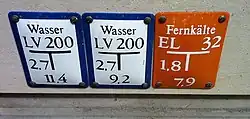 Hinweisschilder auf Vorlaufschieber (VS) und Rücklaufschieber (RS), diese Absperrschieber befinden sich 1,5 Meter links vom Schilderpaar, jede Leitung mit Rohrnennweite DN 80 und Nennbetriebsdruck PN 16