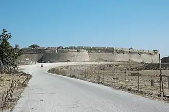 Die Wehrmauer mit einem Umfang von 970 m bildet ein unregelmäßiges Viereck als Grundriss. Der Wehrgang ist mit einem Zinnenkranz bestückt, die Anlage turmlos. Der Haupteingang befindet sich an der Nordwestseite und wurde nachträglich durch eine Bastion gesichert. Oberhalb des Innentores ist das Wappen des Großmeisters Pierre d’Aubusson mit der Jahreszahl 1494 in der Mauer eingelassen. Dem Gesims nach zu schließen befanden sich darüber Mordlöcher.