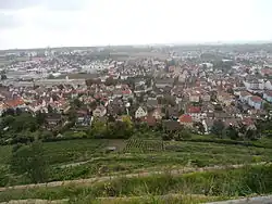 Die Hänge im Osten und Norden sind bewaldet; nach Westen zu schließt sich der schmale, etwa zwei Kilometer lange, anfangs 310–300 m ü. NHN[1] hohe Hügelrücken Hurst an. Auf der terrassierten Südflanke wird Wein angebaut. Unter den Weinbergen liegt die Kleinstadt Asperg in einer sich von West nach Ost ziehenden natürlichen Mulde, jenseits derer auf dem sie gegenüber begrenzenden Hügelrücken im Süden der nur 317,4 m ü. NHN[1] hohe Grabhügel Kleinaspergle steht.