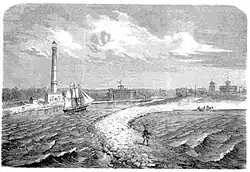 Ab 1848 wurde für den Schutz der Swine-Mündung der Bau der Befestigungsanlagen von Swinemünde befohlen und ausgeführt. Von 1852 bis 1857 war Franz von Kleist Festungsbaudirektor, der die Anlagen nach der neupreußischen Befestigungsmanier gestaltete.[15] Begonnen wurde mit dem Werk I auf der Ostseite der Swine und mit der Engelsburg, später als Werk III bezeichnet, auf der Westseite. Diese Anlagen wurden 1848 bzw. 1854 bis 1858 erbaut. Ab 1856 war eine ständige Garnison als Besatzung der Festungswerke erforderlich, die bis 1859 durch eine Kompanie des 2. Jägerbataillons gewährleistet wurde. Von 1860 bis 1864 übernahm ein Bataillon des 2. Grenadier-Regiments diese Aufgabe. 1863 wurde Swinemünde zur selbständigen Festung 3. Klasse erklärt.[13] Während des Deutsch-Dänischen Krieges musste ein Teil der preußischen Flotte in Swinemünde Zuflucht suchen und wurde hier von dänischen Schiffen blockiert.[16][17]