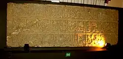 „City Tower Gebäude wurde von prächtigen Melik, Wissenschaftler, fair, triumphierend, prosaisch, Mudschahed (Kämpfer), und der Staat der Religion, die Hochburg des Islam und der Muslime, die größte Khagan, die Shirvanshah Abulhija Manouchehr bin bestellt“. Gefunden im Jahr 1954. Museum für Geschichte von Aserbaidschan...[3]