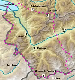 - Süd: Grosser Sankt Bernhard oder Dranse (südlich Saint-Maurice) mit 56 Werken (Artilleriewerke Les Follatères, Champex, Commeire)[7]