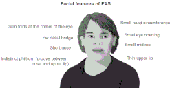 Alkoholkonsum der Schwangeren kann im Prinzip alle Organe und Organsysteme des ungeborenen Kindes schädigen, wenngleich bei typischer Ausprägung des FAS einige Körperteile besonders betroffen sind. Die Diagnose des klassischen Syndroms stützt sich bei schwer betroffenen Kindern besonders auf äußere Merkmale. Dazu zählen: Minderwuchs, Untergewicht, Kleinköpfigkeit (Mikrozephalie), mangelhafte Muskelentwicklung, typische Gesichtsveränderungen, kognitive Entwicklungsverzögerung und Verhaltensstörung(en). Die Schweregrade alkoholbedingter Schädigungen beim Kind haben ebenso wie die individuelle qualitative und quantitative Ausprägung des mütterlichen Alkoholkonsums eine große Bandbreite, die im Einzelfall betrachtet und eingeschätzt werden muss. Nicht alle betroffenen Kinder zeigen alle Merkmale, und die Merkmale sind nicht immer in gleich starker Ausprägung vorhanden. Beim FAS zeigen sich meistens mehr und ausgeprägtere Symptome als beim partiellen FAS. Die körperlichen Schäden können mit Störungen in der Hirnleistung (von Lernschwierigkeiten bis hin zur geistigen Behinderung) und Störung der seelischen, gefühlsbezogenen und sozialen Entwicklung einhergehen. Es kann jedoch nicht pauschal von einer Relation zwischen körperlichen Merkmalen und kognitiven Beeinträchtigungen ausgegangen werden.[23]