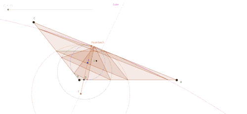 • Der Mittelpunkt des Feuerbachkreises liegt genau in der Mitte zwischen Höhenschnittpunkt und Umkreismittelpunkt, also auch auf der eulerschen Geraden.[2]