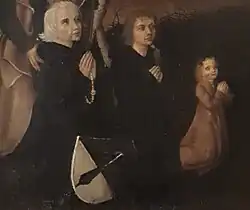 Die Stifterfiguren im Vordergrund sind kleiner als die Figuren der Hauptszene. Sie befinden sich links und rechts in den unteren Ecken des Gemäldes. Die Figuren sind kniend zur Bildmitte hingewandt und blicken auf Kunigunde. Ihre Hände sind in einem Betegestus aneinander gelegt. Auf der linken Seite befinden sich drei unterschiedlich alte Stifterfiguren und ein Heiliger. Der heilige Andreas steht hinter den Stiftern und hat seine rechte Hand auf die Schulter des ältesten Mannes gelegt. In seiner linken Hand hält er ein auf den Boden gestütztes Andreaskreuz. Er trägt einen Mantel über einem dunklen Gewand und hat etwa schulterlange graue Haare und einen Bart. Seinen Kopf umgibt ein goldener Nimbus. Die beiden älteren Personen tragen schwarze Gewänder. Der älteste hat schulterlange graue Haare und hält zwischen seinen Händen einen Rosenkranz, an dem ein Totenschädel zu sehen ist. Zu seiner linken kniet ein etwas jüngerer Mann mit braunen Haaren. Vor den beiden befindet sich ein Wappen. Die dritte Stifterfigur zeigt einen kleinen Jungen mit hellen Haaren in einem langen, helleren Gewand. Er kniet leicht hinter dem mittleren Mann.