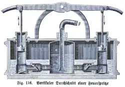 Die ersten Feuerwehrfahrzeuge wurden handwerklich gefertigt und basierten auf dem Bau von Kutschen und Wagen. Bis zum Ende des 19. Jahrhunderts existierten im Wesentlichen nur zwei Typen von Feuerwehrfahrzeugen: Der Spritzenwagen und die Schiebleiter, welche entweder von Pferden oder von der Mannschaft selbst zur Einsatzstelle gezogen wurden.[8] Sie waren aus Holz gebaut und wurden durch Muskelkraft betrieben, weshalb man sich im Einsatz nicht immer auf sie verlassen konnte. Infolge der Industrialisierung kam es zur Technisierung und damit zur Motorisierung der Feuerwehren, allerdings nur sehr zögerlich, da man seitens der Feuerwehrleute Bedenken hatte, mit benzingetriebenen Fahrzeugen nahe an Brände heranzufahren. Die Geschichte moderner Feuerwehrfahrzeuge beginnt im Jahre 1902, als das Freiburger Unternehmen Grether & Cie. das erste Feuerwehr-Kraftfahrzeug der Welt mit einem Verbrennungsmotor fertigte.[9] Der nächste Meilenstein folgt 1904, als Magirus (später Magirus-Deutz und heute Iveco Magirus) die erste motorgetriebene Drehleiter baute, welche jedoch weiterhin von Hand ausgefahren werden musste. Kurz darauf folgten Motorpumpen, was der Firma Magirus zum wirtschaftlichen Aufstieg verhalf. Auch andere Hersteller von Feuerwehrtechnik begannen damals, Feuerwehraufbauten auf Lastkraftwagen-Fahrgestellen zu installieren.