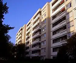 Die Siedlung besteht überwiegend aus Wohnblocks, die in einer Grünanlage verstreut liegen. Entlang der Freischützstraße stehen Punkthochhäuser. Das höchste der Hochhäuser, es steht im Einkaufszentrum der Siedlung, hat 19 Stockwerke und war bei seiner Erbauung das höchste Hochhaus Münchens überhaupt.[1]