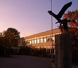 An der Nordseite der Fideliostraße steht ein Freizeitheim, ein Hügel dahinter, aufgeschüttet aus dem Aushub der Wohnbauten, dient zum Rodeln.