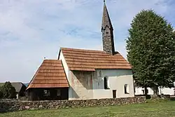 Die Kirche stammt im Kern aus dem zwölften Jahrhundert und ist ein kleiner romanischer Saalbau mit eingezogener Rundapsis, Dachreiter, Holzschindeldeckung und westlicher, hölzerner Vorlaube. Die ursprünglich hoch angesetzten Fenster wurden vermauert und im 13. Jahrhundert durch tiefer liegende, größere ersetzt. Die südliche Fassade dominiert ein Christophorusfresko aus dem 16. Jahrhundert. Das Langhaus besitzt eine hölzerne Flachdecke und eine Holzempore mit Schablonenmalerei, die eine Stifterinschrift aus dem Jahre 1593 aufweist. Von 1964 bis 1966 wurden im Gewölbe der Apsis Fresken aus der Mitte des 13. Jahrhunderts freigelegt. Dargestellt ist eine Kreuzigungsgruppe mit Maria und Johannes, flankiert von zwei kleinen knienden Stifterfiguren. Rechts davon isoliert ist eine Märtyrerin zu sehen.