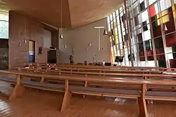 Das neben dem Altar befindliche Vortragekreuz Figuraler gekreuzigter Jesus auf einem Kreuz aus Metallformrohren mit einem farbigen Kreisring aus Email schuf der Seckauer Benediktinermönch, Laienbruder und Kunstschmied Bernward Schmid OSB.
