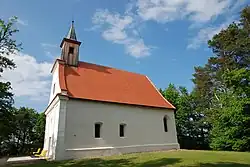 Der gotische Chor mit zwei Spitzbogenfenstern hat einen Dreiachtelschluss. Das Langhaus trägt einen Dachreiter.