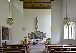 Der Betraum hat eine Flachdecke sowie eine schräg eingezogene Chorbogenwand. Der rechteckige Altarraum ist ebenfalls flach gedeckt. Die Empore ist gerade.