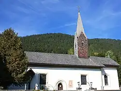 Die Kirche ist ein niedriger spätgotischer Bau, der im 17. Jahrhundert barockisiert wurde. Das nach Westen verlängerte Gotteshaus besitzt einen östlichen Dachreiter mit Spitzhelm. Nördlich am Chor ist eine Sakristei mit einem mit einem spitzbogig abgefasten Portal angebaut. Das Dach wurde 1992 mit Lärchenschindel neu eingedeckt. Bei der Außenrestaurierung 1995 wurde das frühbarocke Dekor des 17. Jahrhunderts mit Eckquadern, Fensterfaschen und Gesimsbändern wiederhergestellt und ein spätgotisches Fresko einer Maria lactans vom Anfang des 15. Jahrhunderts.