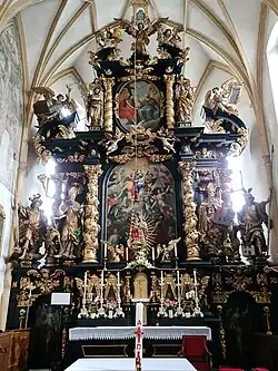 Für den Hochaltar (1682–1684) lieferte Meinrad Guggenbichler das figürliche und ornamentale Schnitzwerk, die Tischlerarbeiten sind von Martin Mayr aus Mondsee, die Fassung besorgte Matthias Wichelhamer, und die beiden Altargemälde stammen von Johann Friedrich Pereth. Guggenbichler schuf für diese Kirche auch einen Großteil der weiteren Ausstattung, so 1689 die Nebenaltäre.