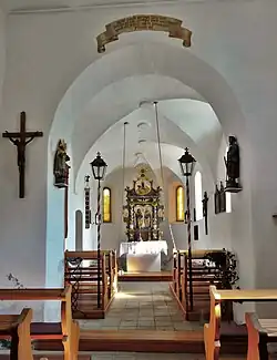 Das Langhaus mit westlicher, hölzerner Empore ist flachgedeckt und öffnet sich zum Chor mit einem rundbogigen Triumphbogen. Der langgestreckte, einjochige Chor mit Kreuzgratwölbung hat im Osten einen 3/8-Schluss.
