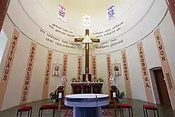 Die Kirche hat ein schlichtes Langhaus unter einem Satteldach. Der Chor im Westen steht über einem kreisrunden Grundriss. Darüber ist eine Kuppel mit Laterne. Im Südwesten ist ein kreisrunder Kirchturm mit Kegeldach. Die Sakristei schließt im Norden an die Kirche an. Der Chor ist durch Rundbogenarkaden mit zwei Säulen zum Langhaus hin geöffnet. Die Glasfenster stammen von Hermann Bauch. Die Ausstattung stammt aus der Bauzeit.