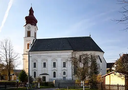 Der Bau hat eine Länge von rund 35 m, eine Breite von rund 10 bis 13 m und eine lichte Höhe von 13,4. Der älteste Teil der Kirche, erbaut um 1495 in spätgotischem Stil, ist der dreijochige Chor mit einem 5/10-Abschluss und das einschiffige Langhaus. Von 1668 bis 1671 wurde die Kirche umgebaut, erweitert und barockisiert. Nach einem Brand im Jahr 1866 erfolgten Zu- und Umbauten und der 21,4 m hohe Turm mit Zwiebelhelm wurde errichtet.