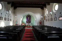 Die dreiachsige geostete Langhaus zeigt Rundfenster in Schräglaibung, herausragend ist der runde Kirchturm mit Zwiebelhelm an der Nordwestecke. Das rechteckige Langhaus hat innen eine Balkendecke und eine Westempore mit einer Holzbrüstung und einer Brüstungsorgel. Der eingezogene Chor hat ein Tonnengewölbe, im Süden ist die Sakristei angebaut. Ein Westfenster zeigt die figurale Glasmalerei hl. Josef mit Jesuskind (1937).