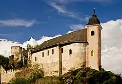Das Kirchenäußere zeigt ein Langhaus mit einem in die Ringmauer der ehemaligen Vorburg einbezogenen rund geschlossenen Chor. Es gibt kleine Rundbogenfenster und Rechteckschlitze, der Turm zeigt ostseitig eine monumentale Wandmalerei des hl. Christophorus aus dem Anfang des 16. Jahrhunderts. Der zweigeschoßige Turm hat Spitzbogen- und Dreipassschlitze und rundbogige Schallfenster. Nordöstlich am Langhaus befindet sich ein teils freigelegtes romanisches Portal aus Hausteinquadern.