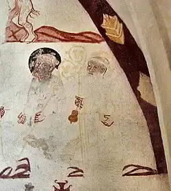 Die mittelalterliche Wand- und Deckenmalerei ist als Seccomalerei ausgeführt. Von 1993 bis 1996 erfolgte ihre Freilegung und Sicherung. Inhaltlich sind die Fresken den Vierzehn Nothelfern gewidmet. Der Kirchenpatron ist im Chor an der Nordwand im Fresko Der hl. Georg im Drachenkampf zu sehen. Die Darstellung zeigt den Heiligen im Kampf mit dem Drachen, der von der knienden Königstochter beobachtet wird. Der Gürtel der Prinzessin ist im Fresko als dünne Linie, die von ihren Armen zum Drachenhals führt, zu erkennen. An der östlichen Chorwand sind der hl. Leonhard und der hl. Antonius dargestellt. Beiden Heiligen wurde im ländlichen Raum als Schutzheilige der bäuerlichen Nutztiere eine besondere Verehrung zuteil. Kopf und Gesicht des hl. Leonhard sind die besterhaltenen Teile der Fresken.