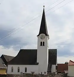 Die Kirche ist ein kleiner gotischer Bau. Der polygonale Chor wird von Strebepfeilern gestützt. An der Nordseite ist eine Sakristei aus dem 19. und eine Kapelle aus dem 16. Jahrhundert angebaut. Der nordwestliche Turm mit rundbogigen Biforienfenstern wird von einem schlanken Spitzdach bekrönt. Das Westportal wird seitlich von Lisenen und oben von einem Gesims gerahmt. An der westlichen Außenmauer ist unter dem Stiegenaufgang zum Musikchor eine römerzeitliche Grabinschrift für Cantius Darbius, Risia, Terentius und Vercilla eingemauert. Ein weiterer römerzeitlicher Grabstein mit Diener- und Schreiberrelief befindet sich an der Nordwand.
