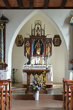 Der kleine gotische Kirchenbau unter einem geschindelten Dach hat eine Vorlaube vor der Westfront und einen eingezogenen niedrigeren quadratischen Chor und östlich einen hölzernen Dachreiter mit einem Pyramidenhelm. Der Chor hat Spitzbogenfenster. Das Westportal ist spitzbogig.