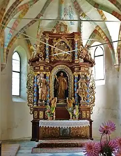 Der barocke Hochaltar mit gedrehten Weinrankensäulen und verkröpftem Gebälk stammt vom Anfang des 18. Jahrhunderts. Den Mittelpunkt des Altars bildet die Figur des heiligen Leonhard, der von Christophorus und Johannes dem Täufer flankiert wird. Im Aufsatz ist im Relief die Heilige Dreifaltigkeit dargestellt. Der mit 1636 bezeichnete Tabernakel stammt von einem älteren Altar.