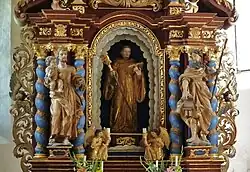Der rechte Wandaltar aus der Mitte des 17. Jahrhunderts ist ein schlichter Ädikulaaltar mit Knorpelwerk. Der Altar wurde nach der Rekonstruktion der ursprüngliche Schwarz-Gold-Fassung mit weißen Säulen 1995 wieder aufgestellt. Das Altarblatt zeigt den Apostel Andreas und eine Szene seines Martyriums im Hintergrund. Am Sockelbild ist Christus und die Samariterin am Brunnen dargestellt, im Aufsatzbild der heilige Leonhard.