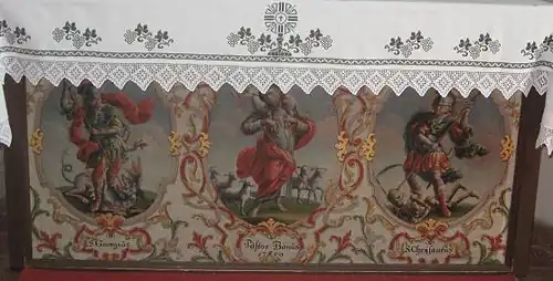 An der Südwand befindet sich eine massive Holztafel aus der Zeit um 1670. Auf dem Hauptbild ist die Beweinung Christi dargestellt. Das Kopfbild zeigt den Heiligen Bischof Ulrich von Augsburg. Die im Vergleich zu den anderen Elementen ältere Tafel hatte wahrscheinlich Vorbildfunktion für die Seitenaltäre.