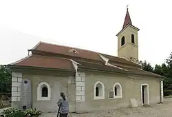 An das Langhaus schließt ein gleich hoher und nur wenig schmälerer, gerade geschlossener Chor an. Die Sakristei an der Nordseite sowie das nördliche Seitenschiff haben Pultdächer. Die geritzte Eckquaderung der Fassade stammt aus dem 16./17. Jahrhundert. An der Nordseite, an der Sakristei und am Seitenschiff befinden sich schmale Rundbogenfenster, im Osten ein zweibahniges Maßwerkfenster und im Süden Spitzbogenfenster. Im Norden ist das Gebäude durch ein Spitzbogenportal zugänglich. Der Westturm weist eine Putzgliederung auf und wird von einem Spitzhelm über rundbogigen Schallfenstern bekrönt.