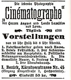 - 27. März: Ab diesem Tag erfolgen in Wien erstmals tägliche Filmvorstellung im Mezzanin des Hauses Kärntner Straße 45/Ecke Krugerstraße 2 im Ersten Wiener Gemeindebezirk. Dort präsentiert Eugène Dupont, ein Gesandter der Lumières, deren erste Werke. Dies geschieht gegen eine Eintrittsgebühr von 50 Kreuzern und ist täglich von 10 Uhr morgens bis 8 Uhr abends möglich.