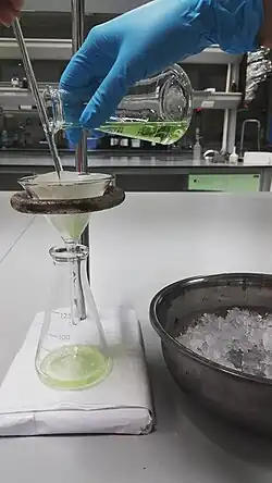 Mechanismus der Kaltfiltration, bei der die auf einem Eisbad auf eine niedrige Temperatur abgekühlte Lösung mit gleichmäßiger Geschwindigkeit in den Filtertrichter (mit Filterpapier) geleitet wird.