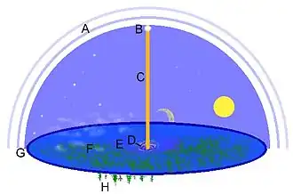 | A Himmelskuppeln B Polarstern C Säule D Kinahmi, der Strudel E Pohjola, das Nordland | F bewohnbare Welt G Lintukoto am Ende der Welt H Tuonela, das Totenreich, wahrscheinlich kopfüber |