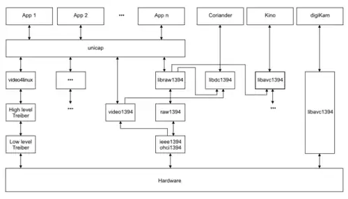 - Videokameras werden über verschiedene APIs bedient. Stellvertretend wird im Bild rechts der Zugriff des Schnittprogramms Kino auf die API libavc1394 gezeigt. Kino greift auf weitere APIs zu, die im Bild aus Gründen der Übersichtlichkeit nicht gezeigt sind.