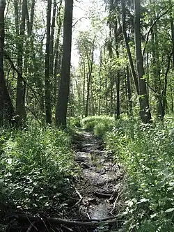 ![]() Die Fischach durchfließt im Gewann Alte Fischach nach Vereinigung aller Quelläste einen Bruchwald. Aufnahme im späten Mai nach Trockenperiode. | ||