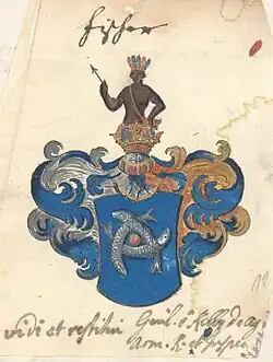 - Blasonierung des Stammwappens (1708): In Blau eine goldene Kugel zwischen drei triangelweise verflochtenen silbernen Fischen. Auf dem gekrönten Helm mit rechts blau-silbernen und links blau-goldenen Helmdecken ein wachsender natürlicher Indianer in blau-gold gestreiftem Leibschurz und Kopfputz, mit an der linken Seite an goldener Schnur hängendem goldenen Köcher, in der Rechten einen stählernen Pfeil haltend, die Linke eingestemmt.