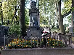 An der Trauerprozession, die am 12. Februar von Dostojewskis Wohnung über den Newski-Prospekt zur Kirche des Alexander-Newski-Klosters führte, nahmen Zehntausende Menschen teil.[161] Die Beerdigung, bei der Solowjow die Rede hielt, fand einen Tag später auf dem zum Kloster gehörigen Tichwiner Friedhof statt.[162] Sein Grabstein trägt als Inschrift das dem Roman Die Brüder Karamasow vorangestellte Christuswort: