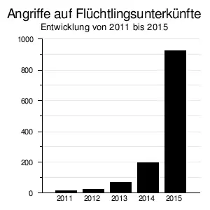 Immer wieder kommt es zu Angriffen auf Flüchtlinge, Asylbewerber und deren Unterkünfte. Dazu zählen Delikte wie Volksverhetzung (z. B. durch neonazistische Aufmärsche vor den Unterkünften), Sachbeschädigung (z. B. durch Schmierereien von rechtsradikalen Parolen) bis hin zu Brandanschlägen. Seit 2011 nimmt die Zahl der Angriffe auf Flüchtlingsunterkünfte stark zu. Laut Bundeskriminalamt (BKA) kam es 2011 zu 18, 2012 zu 23 und 2013 zu 69 Straftaten gegen Flüchtlingsunterkünfte.[50] Im Jahr 2014 registrierte das BKA 199 Straftaten gegen Flüchtlingsunterkünfte, was mehr als das Doppelte gegenüber dem Vorjahr darstellt.[51] 2015 hat sich die Anzahl der Angriffe im Vergleich zum Vorjahr mehr als vervierfacht – das BKA zählte 924 Straftaten, darunter 76-mal Brandstiftung und 11-mal versuchte Brandstiftung.[52]