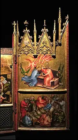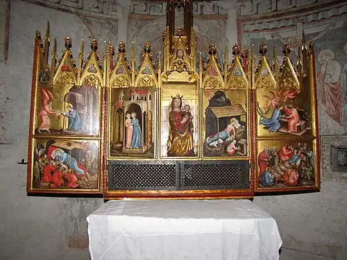 Der Altar zeigt in geöffnetem Zustand einen Marienzyklus, beginnend mit der Verkündigung am linken Flügel oben.[3] Der Zyklus setzt sich fort an den Nischenflügeln mit Szenen von der Heimsuchung und der Geburt Christi, dann mit der Anbetung der Könige wieder am linken Flügel sowie abschließend am rechten Flügel mit dem Tod und der Krönung der Muttergottes. Es sind insgesamt sechs Altarbilder, die das Leben Mariens erzählen. In den Wimpergen befinden sich die Brustbilder der Heiligen Katharina, Ursula, Margarete und Elisabeth. In der leeren Mittelnische stand ursprünglich eine Skulptur, die verloren gegangen ist. Sie bildete das Zentrum des Flügelaltars. Es wird angenommen, dass es eine sitzende Madonna mit Kind war.