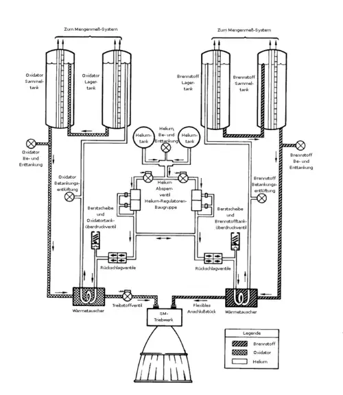 Schema des druckgasgeförderten Antriebs des Apollo-Raumschiffs (CSM)