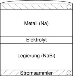 Eine Flüssigmetallbatterie ist ein elektrochemischer Energiespeicher, deren Anode, Kathode und Elektrolyt sich während des Betriebs im flüssigen Aggregatzustand befindet.[1][2][3] Für den Betrieb sind vergleichsweise hohe Temperaturen nötig, damit die einzelnen Materialien in flüssiger Form vorliegen, was eine entsprechende thermische Isolierung gegenüber der Umgebung erfordert. Diese Batterien zählen zu den Thermalbatterien. Flüssigmetallbatterien werden als stationärer Elektro-Energiespeicher für stark fluktuierende erneuerbare Energien diskutiert.[4][3][5][6]