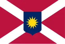 Vorgeschlagene Nationalflagge 1862„Die Flagge besteht aus einem roten Feld, auf dem ein weißes Schrägkreuz aufgebracht ist. Im Zentrum soll eine Sonne auf blauem Grund mit 13 Strahlen stehen. Diese entsprechen der Anzahl der Konföderationsmitglieder.“