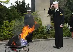 In den USA steht der eigentliche Akt des Verbrennens der eigenen Flagge nicht unter Strafe, einige Organisationen wie Scouting America oder die Amerikanische Legion verbrennen beschädigte oder verschmutzte Flaggen sogar als rituelle Ehrerbietung. Es kann aber strafrechtlich verfolgt werden, wenn dabei die öffentliche Ordnung gestört oder fremdes Eigentum beschädigt wird. Bestrebungen, die Verfassung um die Strafbarkeit zu erweitern, beschreibt das Flag Desecration Amendment (Flaggenschändungsergänzung).