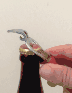 - Bild "Schweizer Taschenmesser": Als Sparversion dient ein flaches Metallstück mit einer Aussparung am Rande, deren eines Ende auf den Deckel drückt, während das andere unter den Rand des Kronkorkens gehakt wird. Ist das Metallstück sehr flach und der Griff zu hoch, kann man damit zur Seite wegkippen oder abrutschen.