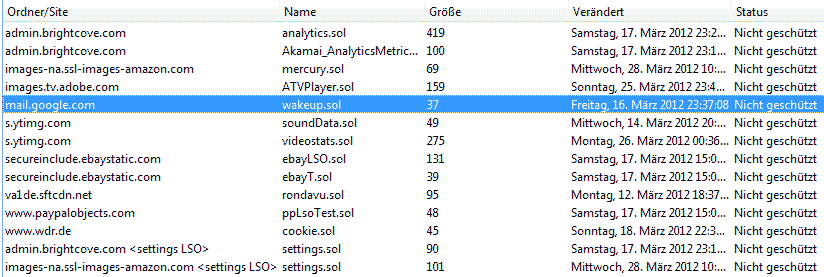 Liste von Flash-Cookies auf einem PC – Ausschnitt aus einem Screenshot von BetterPrivacy