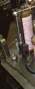 Die Fadenbruchüberwachung ist in Anbetracht dieser Zeit bemerkenswert, da es diese rein mechanische Automatik ohne eine heute bekannte Sensorik nur bei diesen Maschinen gab. An der Seite jedes Klöppels ist ein Schieber oder eine Lasche angebracht, der über Umlenkhebel oder -rollen durch die Fadenspannung in der Höhe gehalten wird. Reißt der Faden, so fällt der Schieber nach unten und drückt beim Vorbeiführen eine seitlich angeordnete Auslösestange nach außen bzw. kämmt einen Schalter, der wiederum Zahnräder außer Eingriff bringt. In der Folge wird die Maschine oder auch nur diese Flechtstelle außer Betrieb gesetzt, ohne dass zwangsläufig ein Fehler im Geflecht entsteht (siehe Abbildung Fadenbruch).