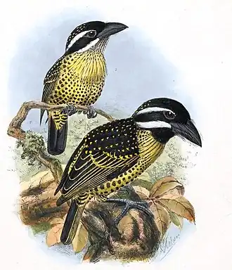 Die Männchen der Nominatform haben einen blauschwarzen Kopf. Auch Kehle und Kinn sind blauschwarz. Ein dünner weißer Augenüberstreif verläuft bis in den Nacken, ein zweiter weißer Streif verläuft von der Schnabelbasis über die Wangen in Richtung Nacken. Die Körperoberseite ist schwarz mit feinen gelben Flecken. Die Steuerfedern sind schwarzbraun. Frisch vermausert weisen sie einen feinen gelben Saum auf. Die Federschäfte sind hornfarben bis weiß. Die Federn an der schwarzen Kehle und auf der gelben Vorderbrust haben feine lange, haarähnliche schwarze Spitzen. Die Körperunterseite ist ansonsten gelb mit tropfenförmigen schwarzen Flecken. Der Schnabel ist schwarz, die unbefiederte Haut rund um die Augen schwarzgrau, die Augen sind rot bis rotbraun. Beine und Füße sind grau. Jungvögel ähneln den adulten Vögeln, junge Weibchen haben auch frühzeitig ein gelblicheres Gefieder. Insgesamt ist ihr Gefieder jedoch noch matter als bei den Adulten.