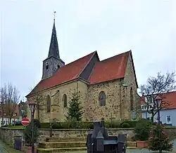 Die mittelalterliche Kirche hatte getrennte Eingänge für Frauen und Männer, die später zugemauert wurden. Der Zugang für Männer an der Südseite der Kirche ist an seinem gotischen Spitzbogen zu erkennen; in der Nische des Fraueneingangs wurde eine Sandsteinplastik angebracht. Die Kirche war mit Fresken ausgemalt, von deren eine Teufelszene links neben dem Chor erhalten ist. Das spätgotische Chorgestühl wurde entfernt; es befindet sich im Kulturgeschichtlichen Museum in Osnabrück sowie im Kestner-Museum in Hannover.