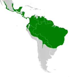 Der Fledermausfalke bewohnt ein sehr großes Verbreitungsgebiet, das sich über weite Teile der Neotropis erstreckt. In Südamerika wird fast der gesamte Norden und Osten des Kontinents besiedelt, wobei die südliche Grenze in etwa auf Höhe des brasilianischen Bundesstaates Paraná verläuft. Von dort aus verläuft sie in nordwestlicher Richtung durch den Süden Paraguays und den äußersten Norden Argentiniens nach Zentralbolivien, bis im Westen schließlich die Anden eine natürliche Begrenzung darstellen. Westlich der Bergkette reicht das Verbreitungsgebiet in südlicher Richtung nur bis nach Ecuador und als schmaler Streifen bis kurz hinter die peruanische Grenze. Über den Isthmus von Panama reicht das Verbreitungsgebiet weiter nach Mittelamerika, ist dort aber nicht mehr so zusammenhängend wie weiter südlich. In vielen Regionen werden nur die Ebenen entlang der Pazifik- und Karibikküste besiedelt, wobei sich auf der karibischen Seite zumeist die höheren Populationsdichten finden. Die nördliche Grenze verläuft durch die mexikanischen Bundesstaaten Sonora im Westen und Tamaulipas und Nuevo León im Osten, womit minimal die Nearktis erreicht wird. Darüber hinaus wird eine Reihe vorgelagerter Inseln, darunter Trinidad und die Perleninseln, besiedelt. Lokal gilt der Fledermausfalke noch immer als häufig anzutreffender Brutvogel, in einigen Regionen sind jedoch in der Vergangenheit bereits starke Bestandsrückgänge zu verzeichnen gewesen.[3] Obwohl auch global ein moderat rückläufiger Populationstrend erkennbar ist, führt die IUCN den Fledermausfalken noch immer auf der niedrigsten Gefährdungsstufe least concern („nicht gefährdet“), wofür vor allem das sehr große Verbreitungsgebiet als Begründung dient. Bestandsschätzungen der Vogelschutzorganisation Partners in Flight aus dem Jahr 2019 gehen von einer Population in der Größenordnung zwischen 500.000 und 5.000.000 adulten Individuen aus. Für den Rückgang der Bestandszahlen wird vor allem der Verlust von Lebensraum durch die zunehmende Entwaldung vieler süd- und mittelamerikanischer Regionen verantwortlich gemacht.[8]
