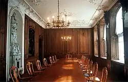 Im zweiten Obergeschoss befindet sich ein aus dem Seitenflügel des einstigen Dimpkerschen Hauses (Breite Straße 12) stammender Saal des 18. Jahrhunderts. Dabei handelt es sich um eines der wichtigen erhaltenen Rokoko-Interieurs der Stadt aus dem Jahr 1762, bestehend aus einer reichen Stuckdecke mit Rocaillen und Blumenranken in den Voluten. Die Täfelung ist aus Eichenholz. In den Feldern der Täfelung sind vergoldete Rocaillen und Blumengehänge zu sehen. Sie wird durch zwei Wandspiegel an der Fensterseite des Saals aufgehellt, die ebenfalls reich mit Ornamenten geschmückt sind. In der Täfelung befindet sich ein Wandschrank und in der Ofennische ein Kachelofen aus Stockelsdorfer Fayence mit blau-weißen, in Gold abgesetzten Kacheln.[1] Auftraggeber dieses Innenausbaus war der Lübecker Bürgermeister Joachim Peters.
